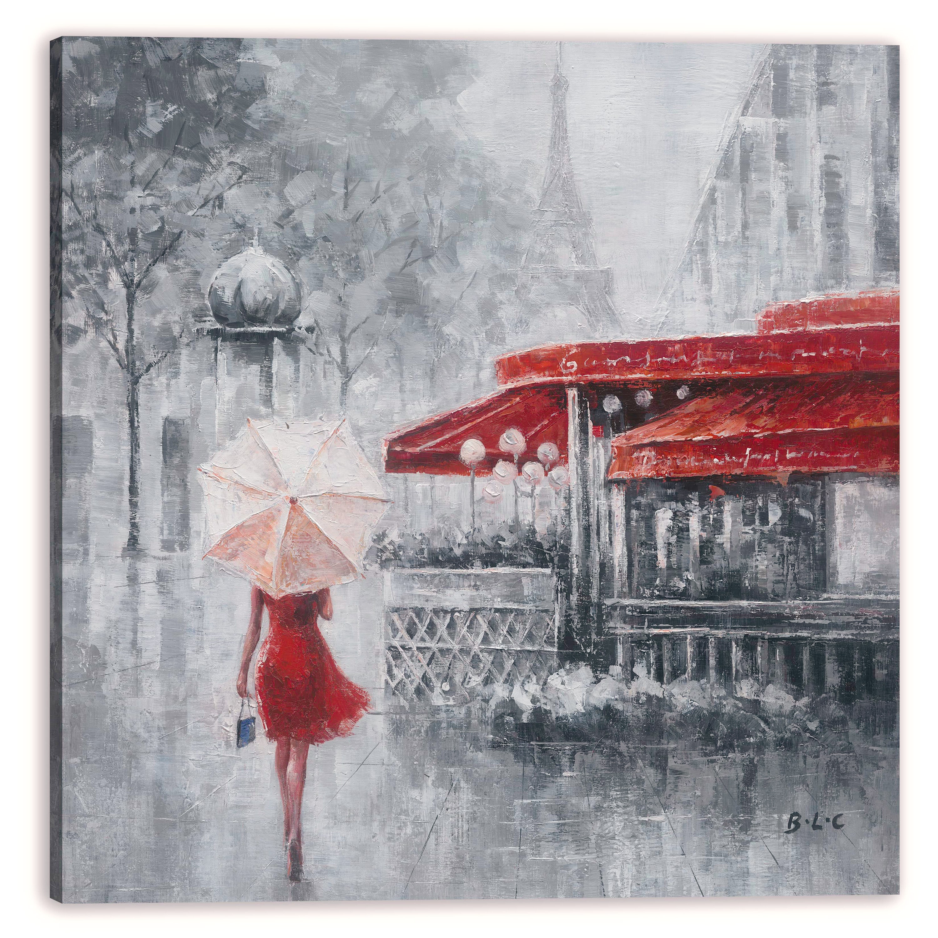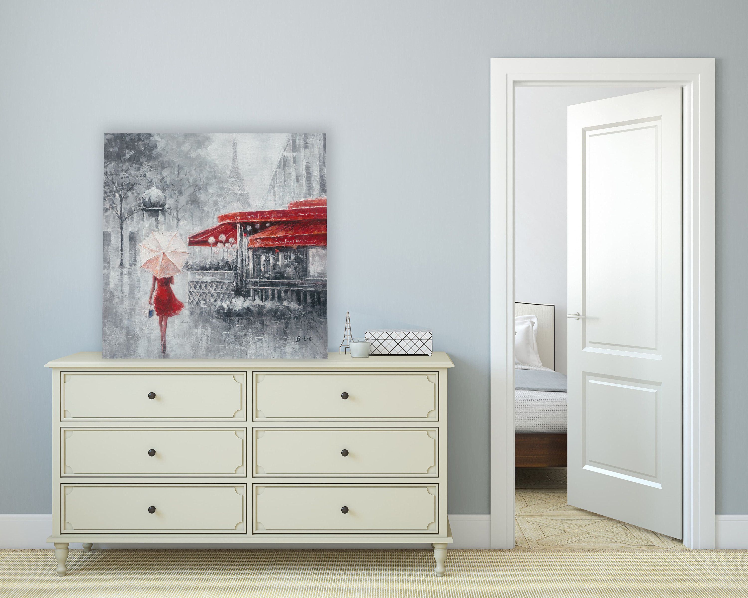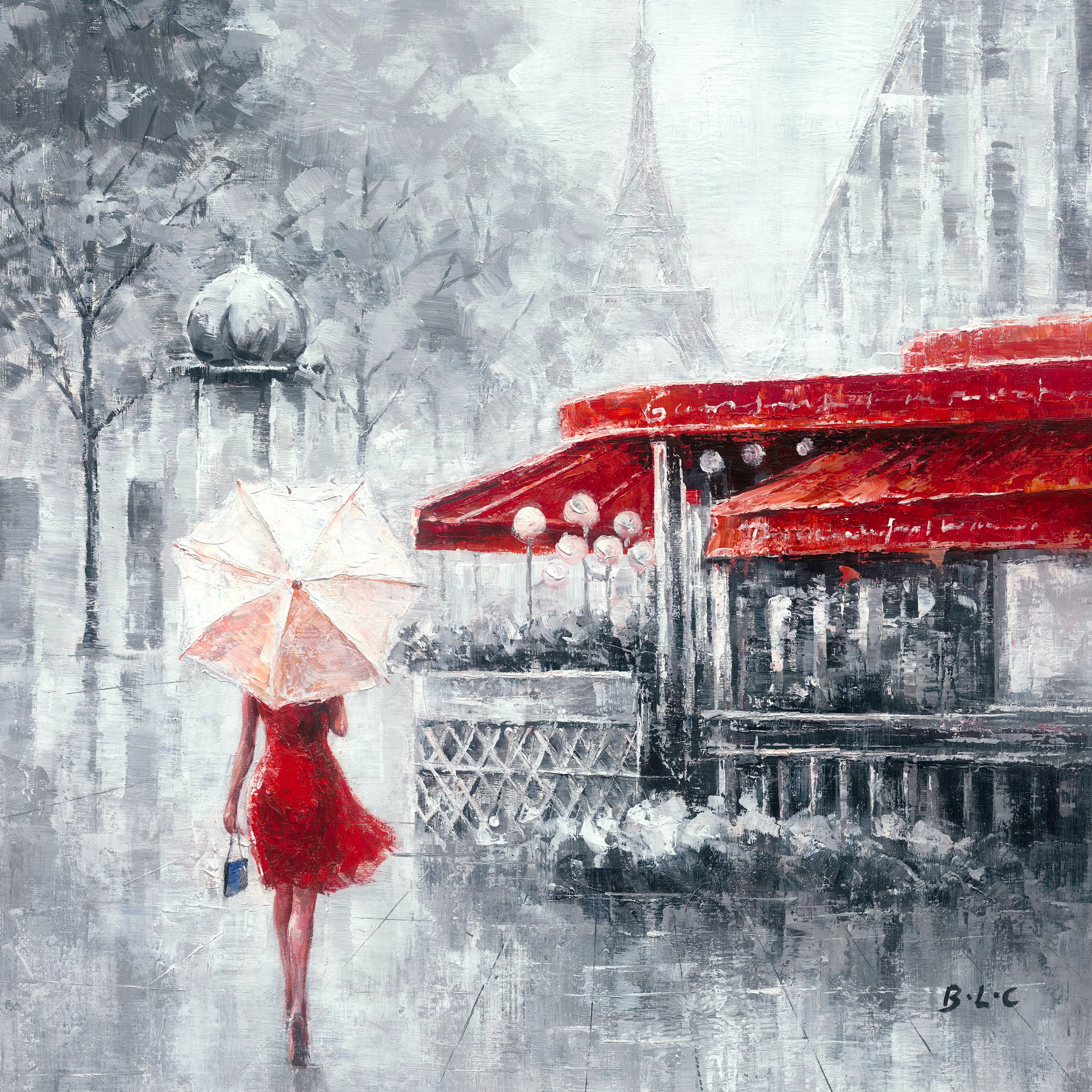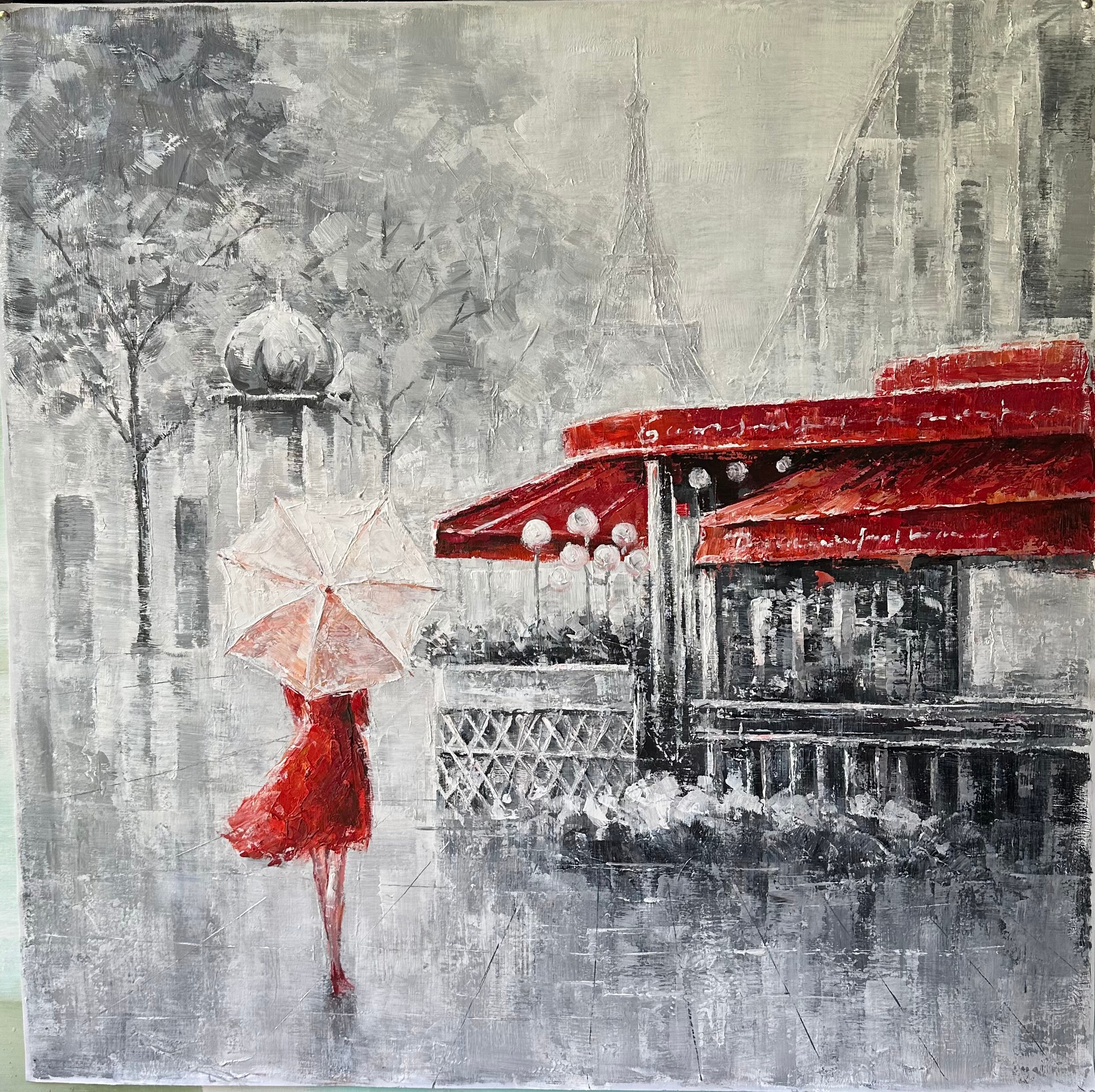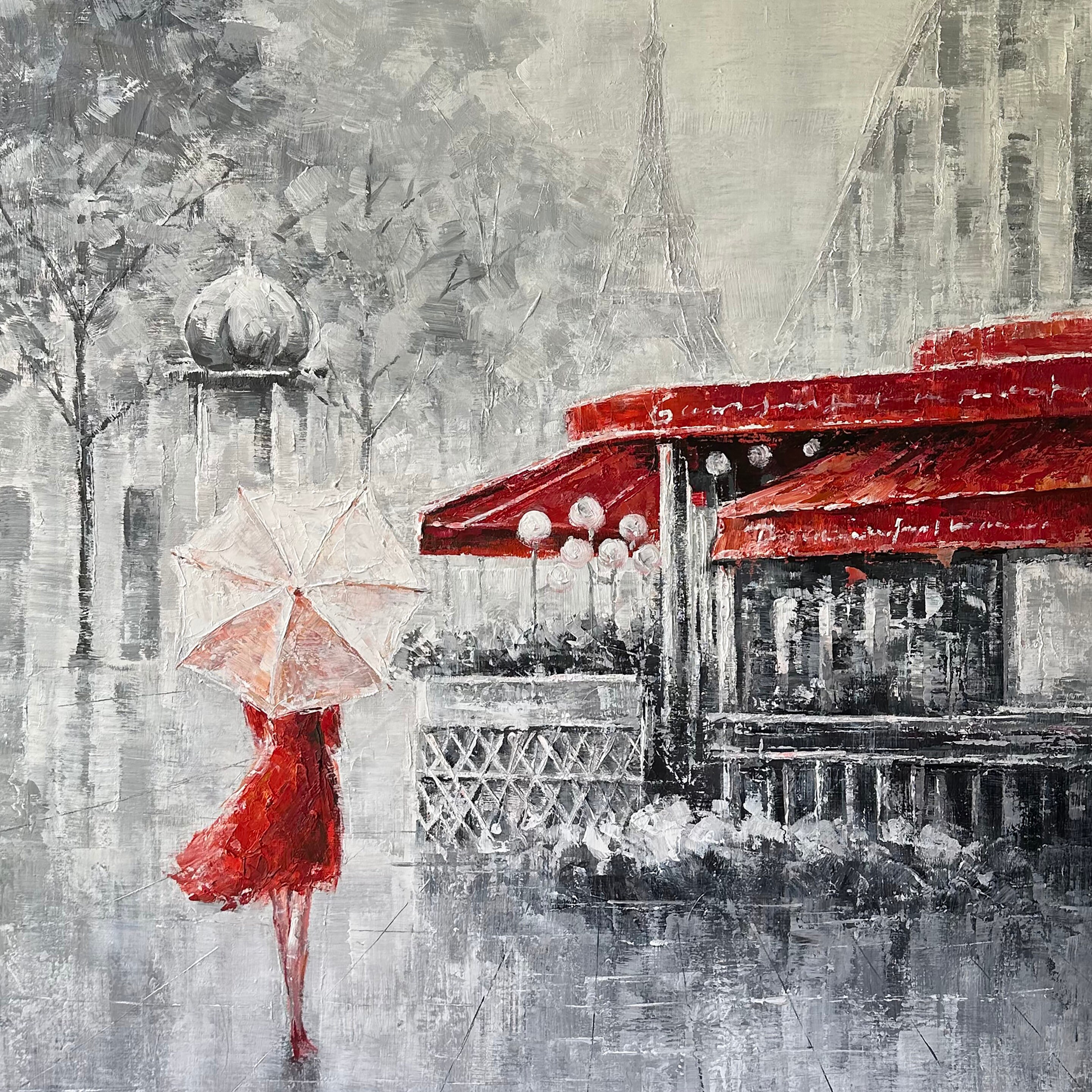 Indulge in the enchanting streets of Paris with our captivating hand-painted artwork, "Parisian Encounter: A Café Delight." This exquisite oil painting captures the essence of the city, featuring the iconic Eiffel Tower as a backdrop while a solitary girl in a red dress elegantly strolls past a charming café, carrying an umbrella.