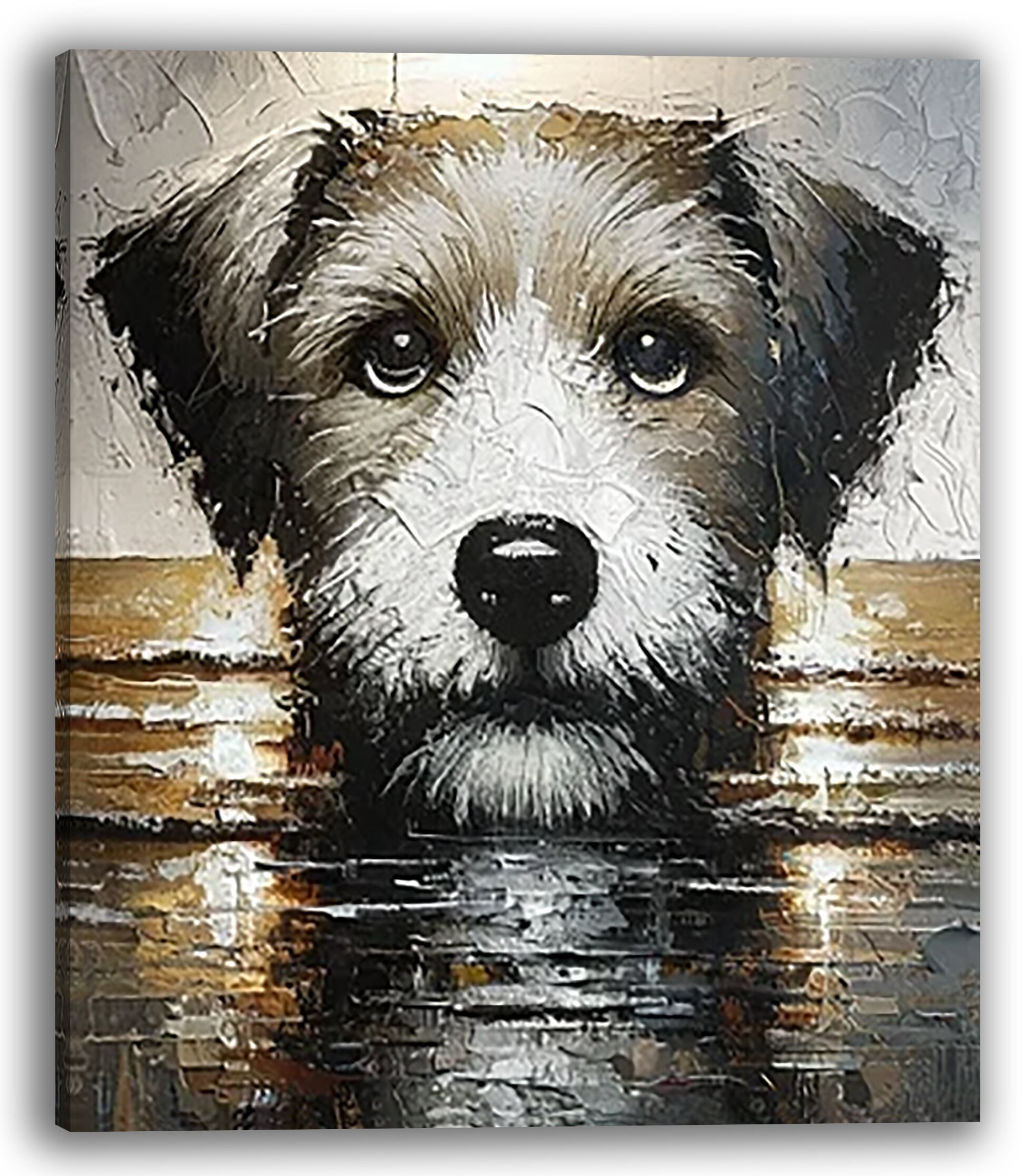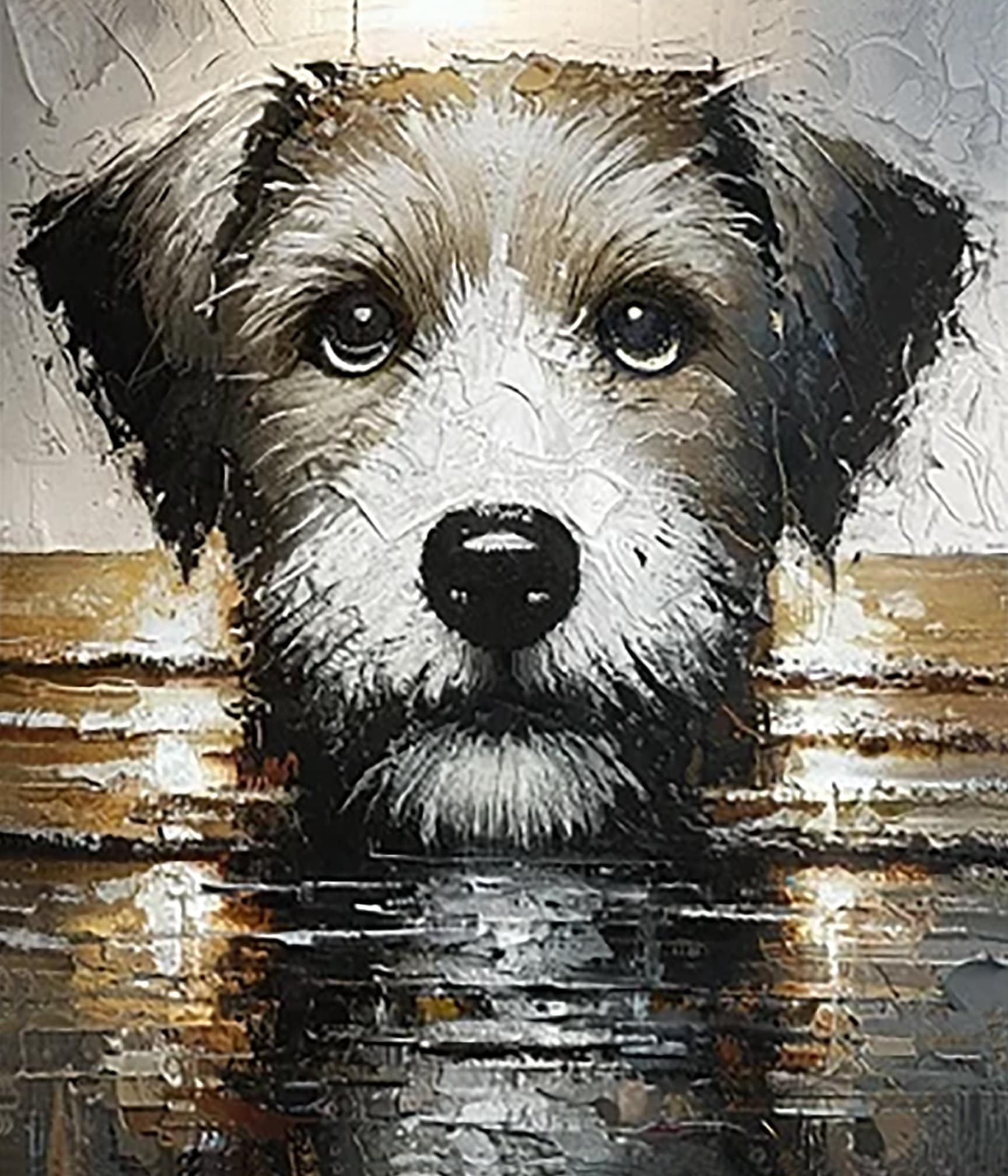 Bring the spirit of your cherished pet to life with "Charming Canine Gaze," an original, textured oil painting that immortalizes the loving essence of your dog. This hand-painted portrait is meticulously detailed, capturing the unique soulfulness of a dog's eyes and the individual beauty of its fur. Measuring 24x28 inches, it serves as a beautiful homage to your furry family member.