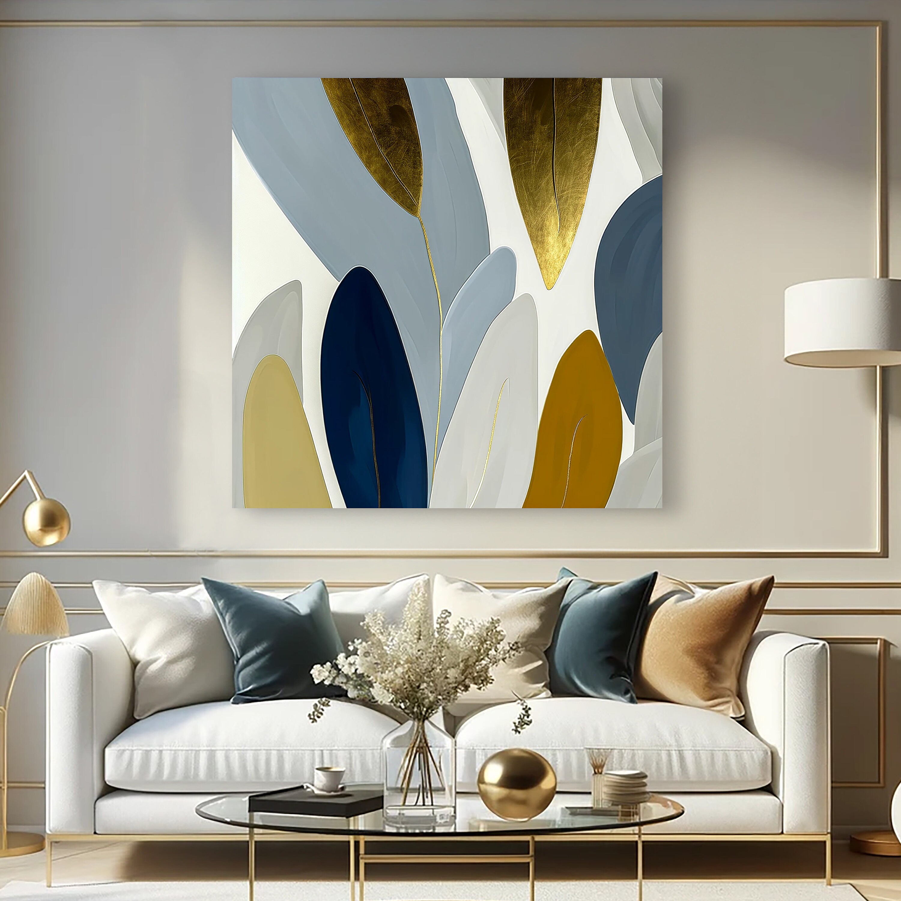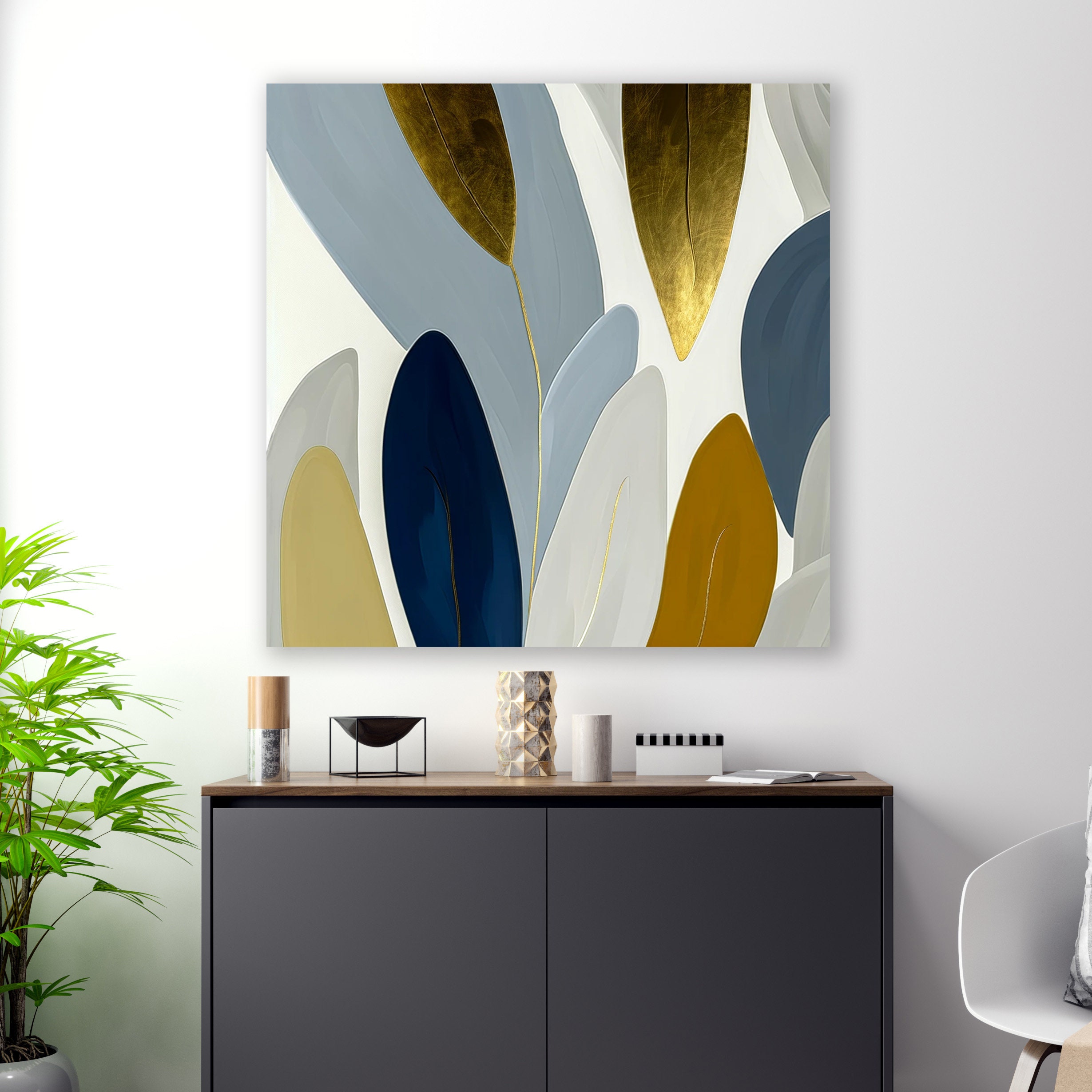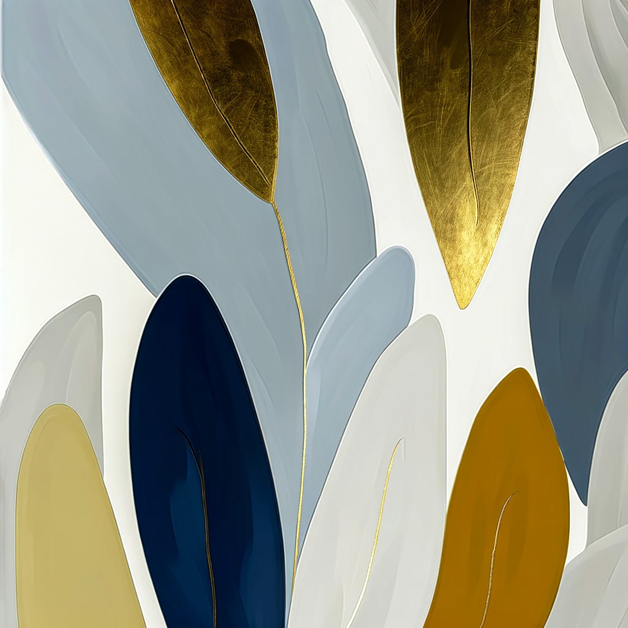 Unveiling 'Whispers of Nature', a hand-painted masterpiece that interprets the silent language of the natural world. This artwork celebrates the serene beauty of botanical elements with a modern twist, perfect for bringing a calming yet luxurious aesthetic to any space. With its slate blue and gold leaf accents set against a background of soft neutrals, each brushstroke contributes to a larger narrative of elegance and tranquility. The real gold leaf detail adds a three-dimensional aspect that plays with light, offering an ever-changing visual experience throughout the day. This painting is not just a visual treat but a tactile journey for the senses. In the world of mass-produced prints, 'Whispers of Nature' stands out as a unique treasure, promising to bring the sophistication of contemporary art and the timeless appeal of nature into your home or office. Add this exclusive artwork to your collection and let your space whisper tales of nature's elegance.