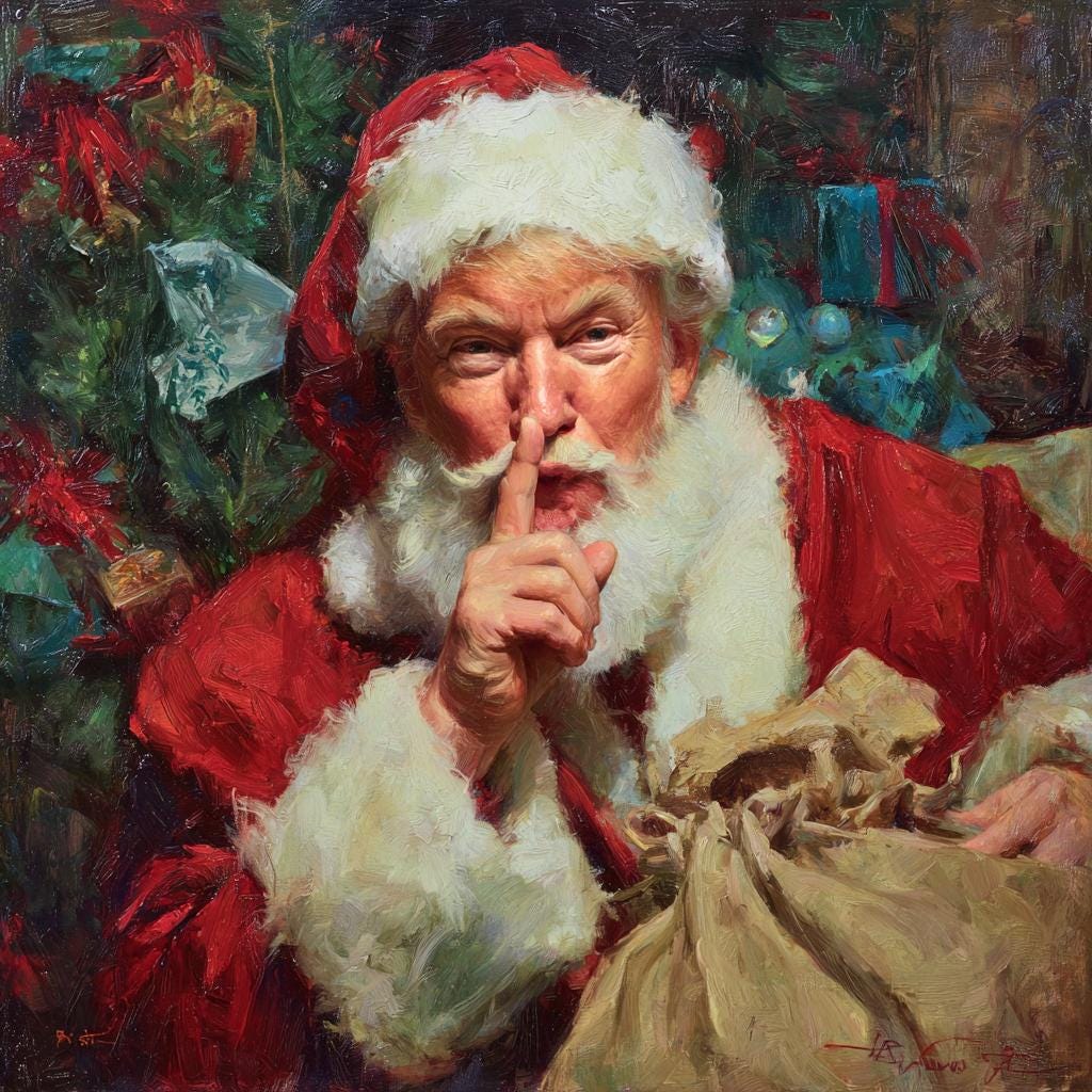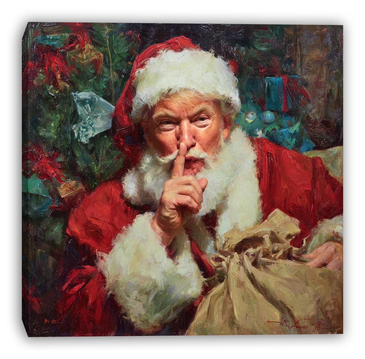 Bring festive charm to your holiday décor with this Secret Santa Surprise wrapped canvas wall art. Featuring Santa in a playful “shh” gesture beside a festive Christmas tree, this artwork blends rich painterly textures with vibrant seasonal color. Printed on demand in a USA studio using high-quality materials, each piece arrives ready to hang and adds cheerful, nostalgic warmth to any holiday setting.
