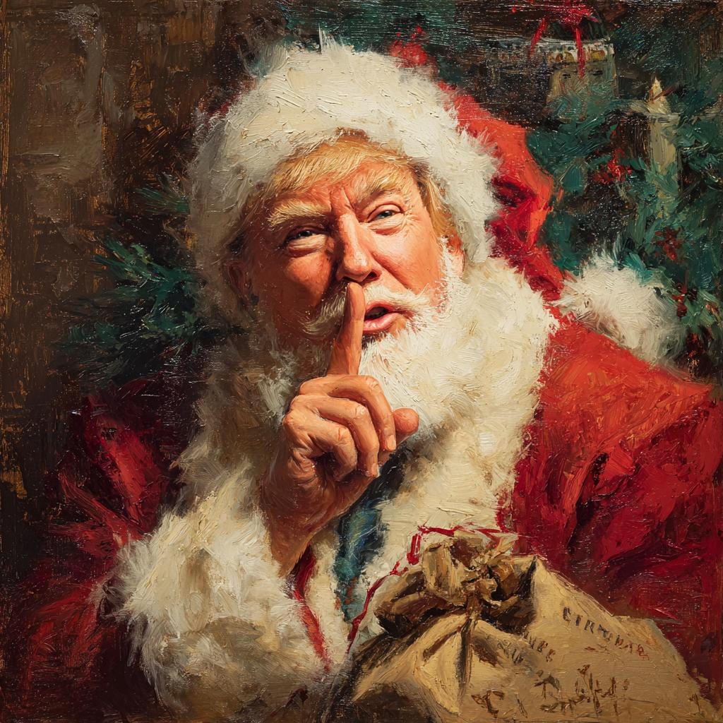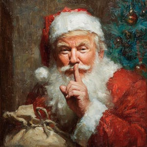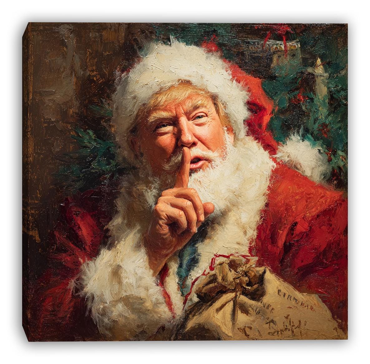 Bring festive charm to your holiday décor with this Secret Santa Whisper wrapped canvas wall art. Featuring Santa in a playful hush gesture beside a warmly decorated Christmas tree, this artwork blends rich painterly texture with vibrant seasonal color. Printed on demand in a USA studio using high-quality materials, each canvas arrives ready to hang and adds nostalgic holiday magic to any room.